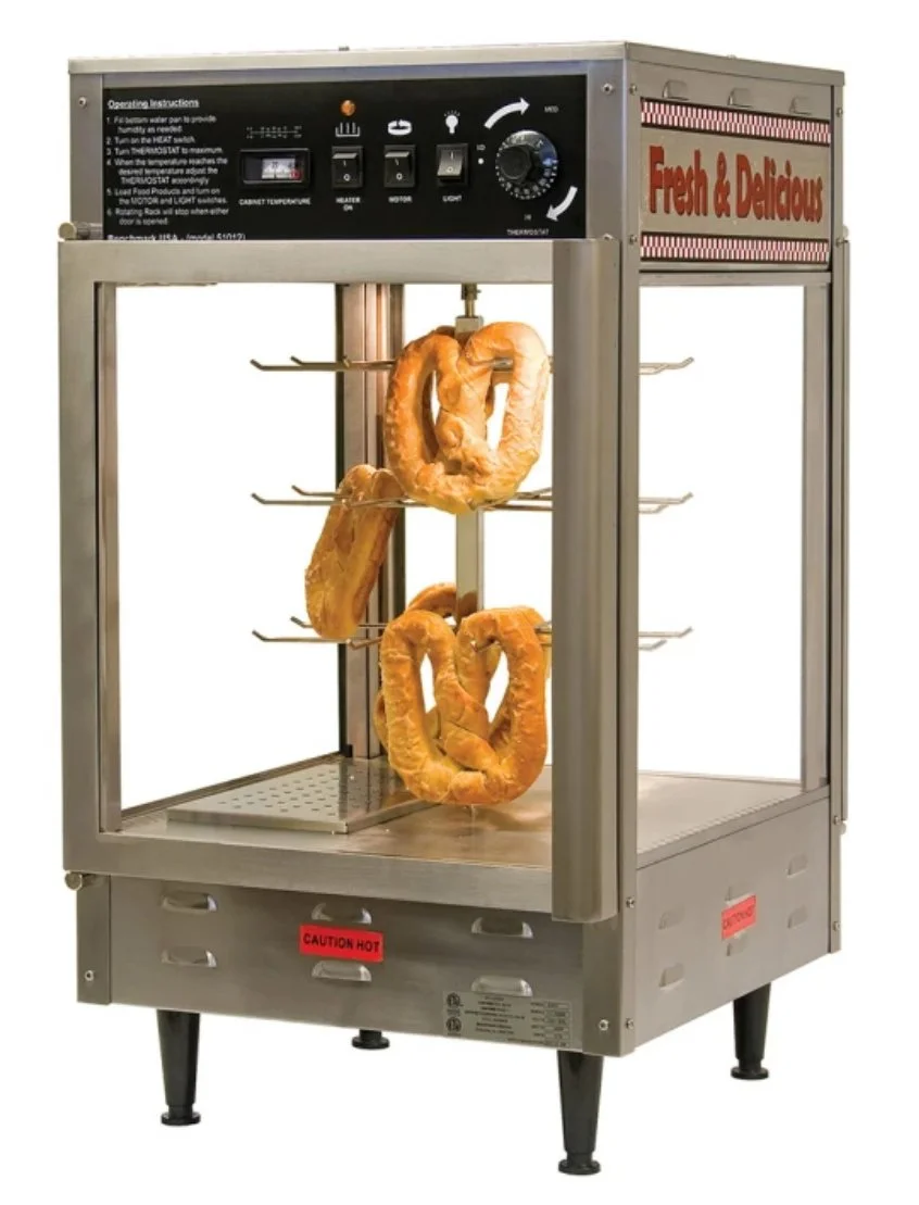 This 1602-watt combo oven, warmer and merchandiser lets you oven-bake your pretzels to their just-right 450° temp, keep them warm in a perfectly humidified compartment and display them for maximum crowd-pleasing.